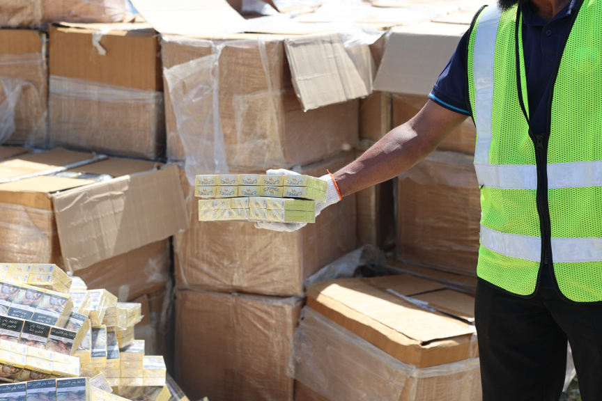 Maldives Customs Service employee holds cigarette packs, the service destroyed over 3.1 million illegally imported cigarettes at K. Dhoonidhoo on October 19, 2025. (Sun Photo/ Maaniu Mohamed)