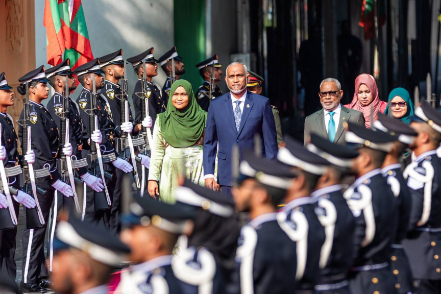 President Dr. Mohamed Muizzu (C) accompanied by First Lady Sajidha Mohamed arrives at the Parliament for his annual address on February 6, 2025. (Sun Photo/Moosa Nadheem)