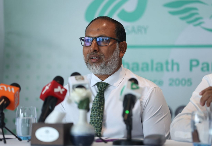 Adhaalath Party's president Imran Abdulla speaks to reporters on October 19, 2025. (Sun Photo/Maaniu Mohamed)