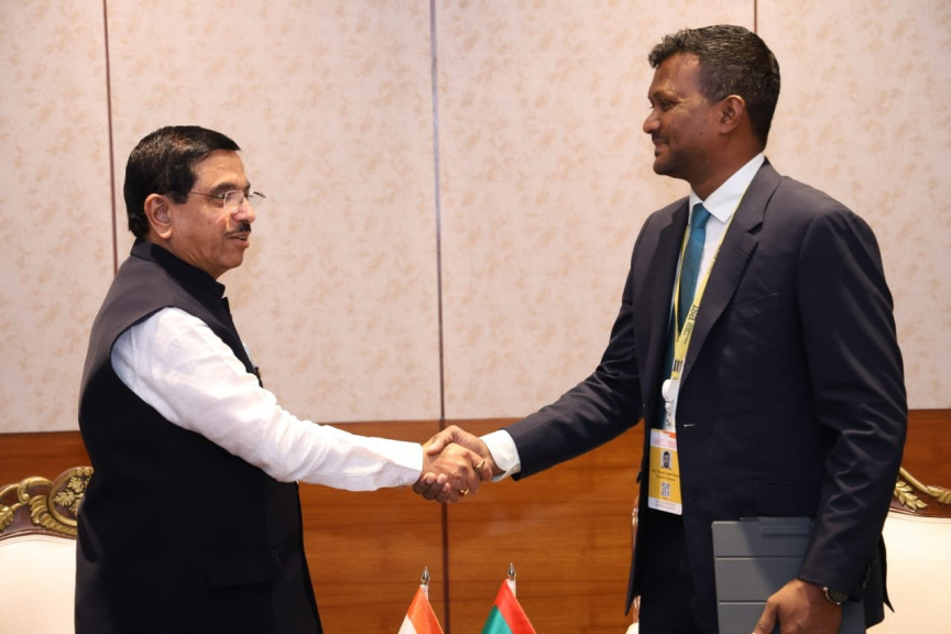Maldivian Deputy Minister for Tourism and Environment, Hussain Ageel Naseer meets with Indian Minister for New and Renewable Energy, Pralhad Joshi on October 30, 2025. (Photo/Environment and Tourism Ministry)