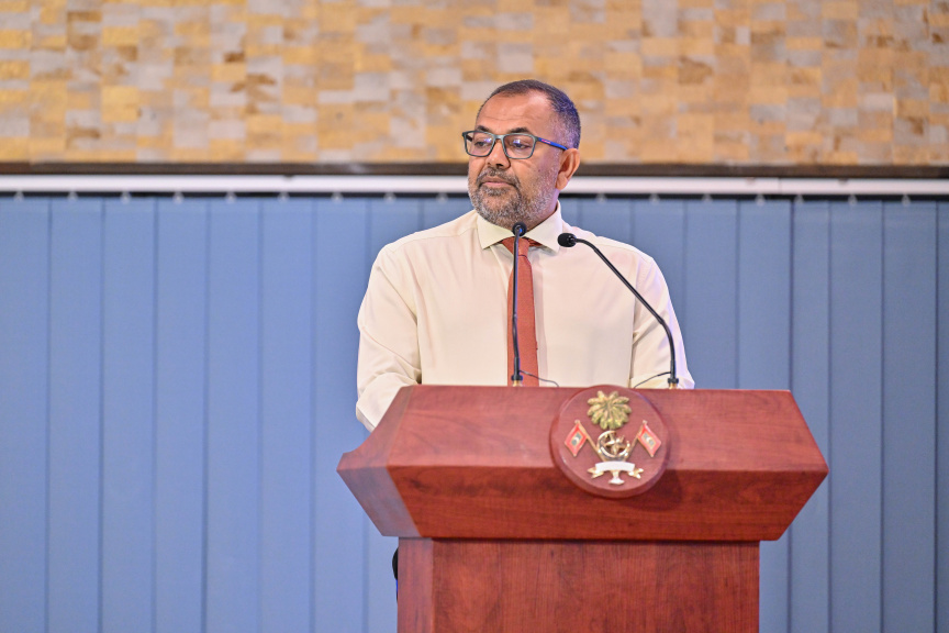 Finance Minister Moosa Zameer speaks at ceremony to award 206 government projects to private companies on November 6, 2025. (Photo/President's Office)