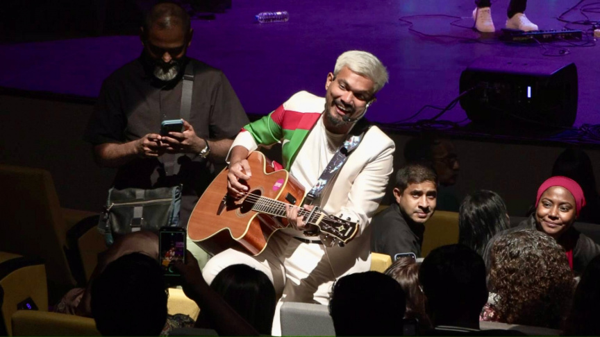 Ahmed Adhuham, lead vocalist and founder of 2ofus performing live at the PJ Live Arts Theatre in Kuala Lumpur, Malaysia, on November 7, 2025. (Photo/2ofus)