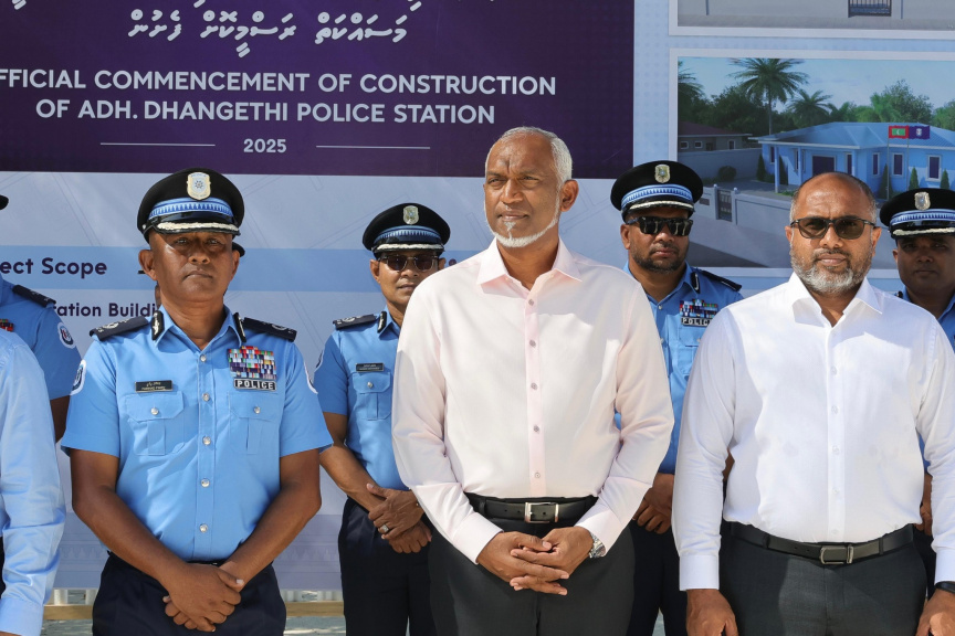 Deputy Commissioner of Police (DCP) Farhad Fikry (L) next to President Dr Mohamed Muizzu and Homeland Minister Ali Ihusaan at the official commencement of construction of A.Dh. Dhangethi Police Station, October 6, 2025. (Photo/Maldives Police Service)