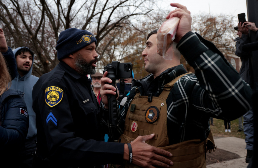 A Dearborn Police Officer confronts far-right activist Jake Lang, as he waves a package of bacon during a protest against Islam in Dearborn, Michigan, U.S. November, 18, 2025. (Photo/Reuters)