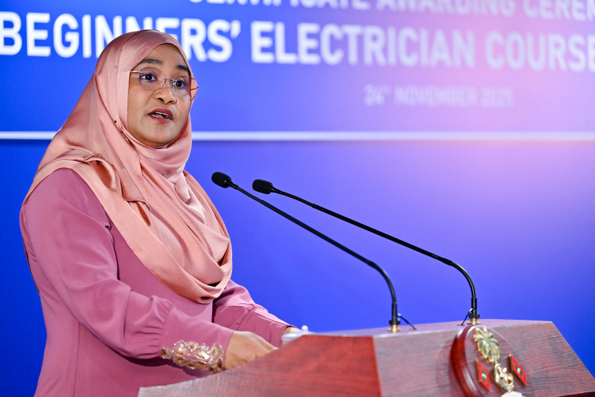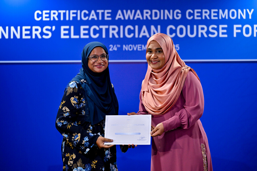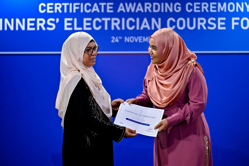 First Lady Sajidha Mohamed presents a certificate to participants of the Beginners’ Electrician Course for Women by STELCO on November 24, 2025. (Photo/President's Office)