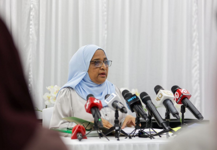 Aishath Azima Shakoor speaks to reporters on March 15, 2025. (Sun Photo/Mohamed Maaniu)