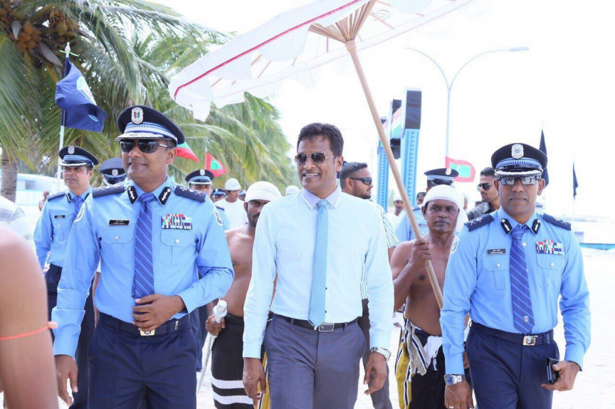Home Minister Umar Naseer arrives in H.A. Hoarafushi to lay the foundation stone for the police station in the island, May 31, 2016. (Photo/Home Ministry)