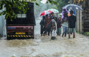 People wade through a flooded street after heavy rains in Sri Lanka. (Photo/AFP)