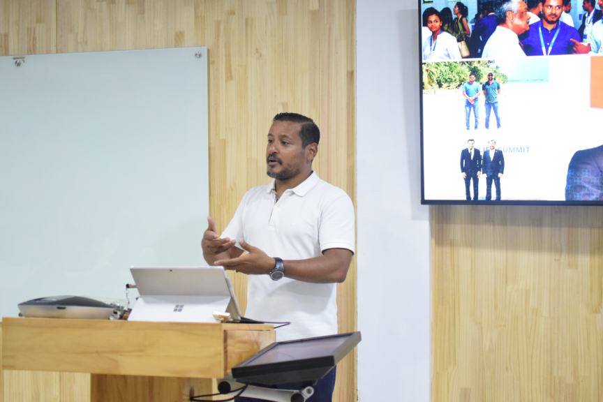 Dr. Hussain Sunny Umar, Founder of Maldives Halal Travel speaks at the Industry Speaker series initiated by Villa College on August 8, 2023. (Photo/Villa College)