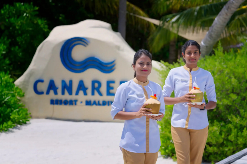 Employees at a resort holding welcome drinks: An amendment has been submitted to the Parliament seeking to prohibit payment of service charge to tourism workers in MVR. (Photo/Canareef Resort Maldives)