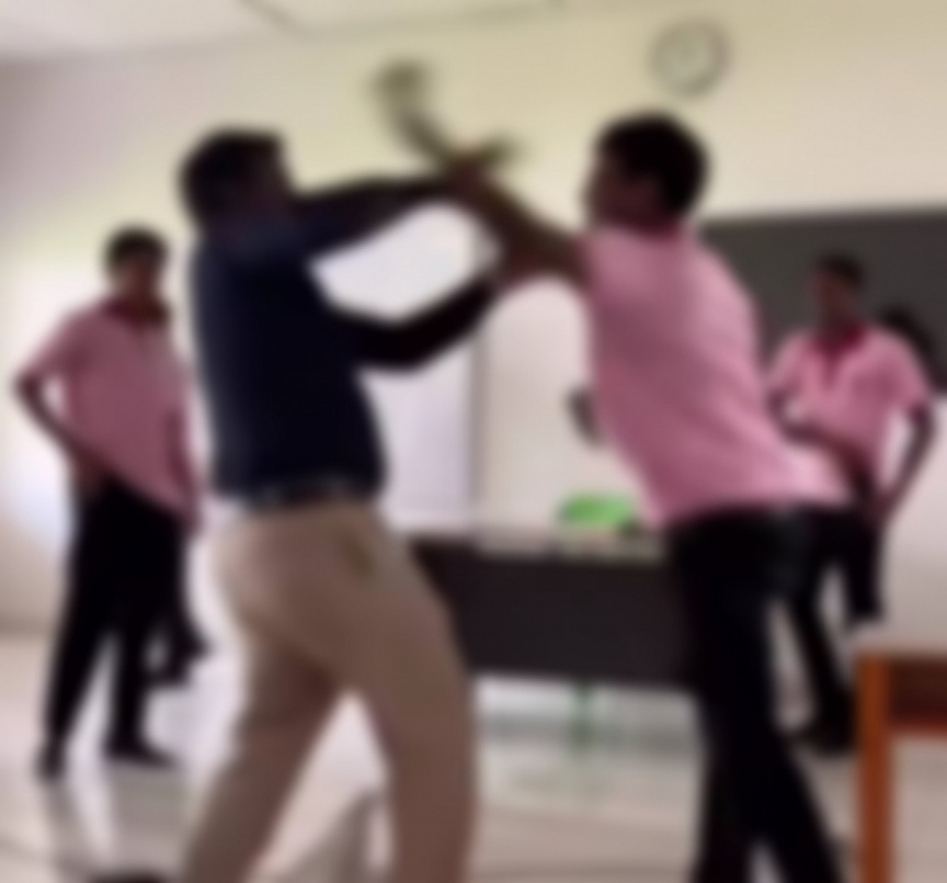 A 47-second video viral on social media shows a male student on the floor, apparently having fallen. He is then jumped by a male teacher, and the two wrestle on the floor, with the teacher seemingly trying to take an item from the student.