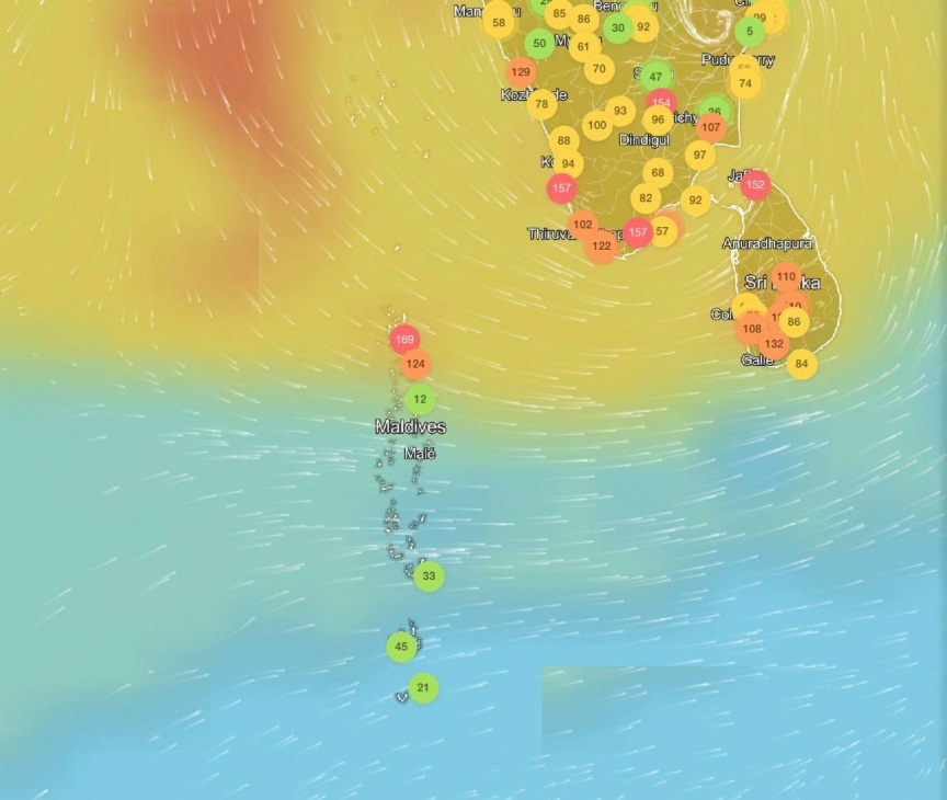 According to the IQ Air, the Maldives currently has an Air Quality Index (AQI) of 57, which falls into the “moderate” category, color-coded yellow. The fine particulate matter (PM2.5) is at 12.9 micrograms per cubic meter, just slightly above the World Health Organization annual PM2.5 guideline value.