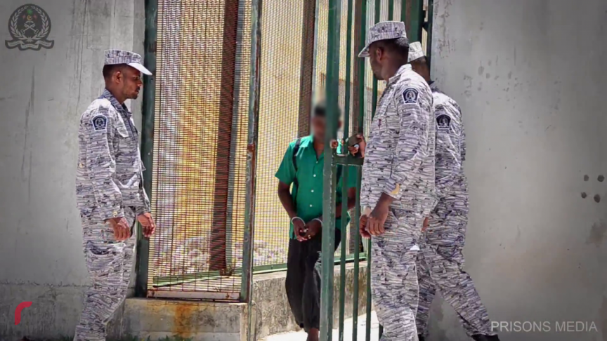 Guards surround an inmate at the Maafushi Prison. (Photo/Maldives Correctional Service)