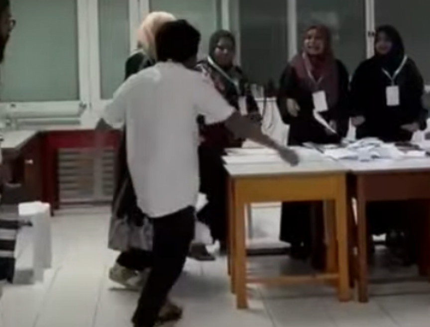 Screen capture from video released by Hathaavees news shows a man approaching the PNC primary elections officials desk for the Mahchangolhi North constituency, citing fake votes, to stop the ballot counting, December 27, 2025.