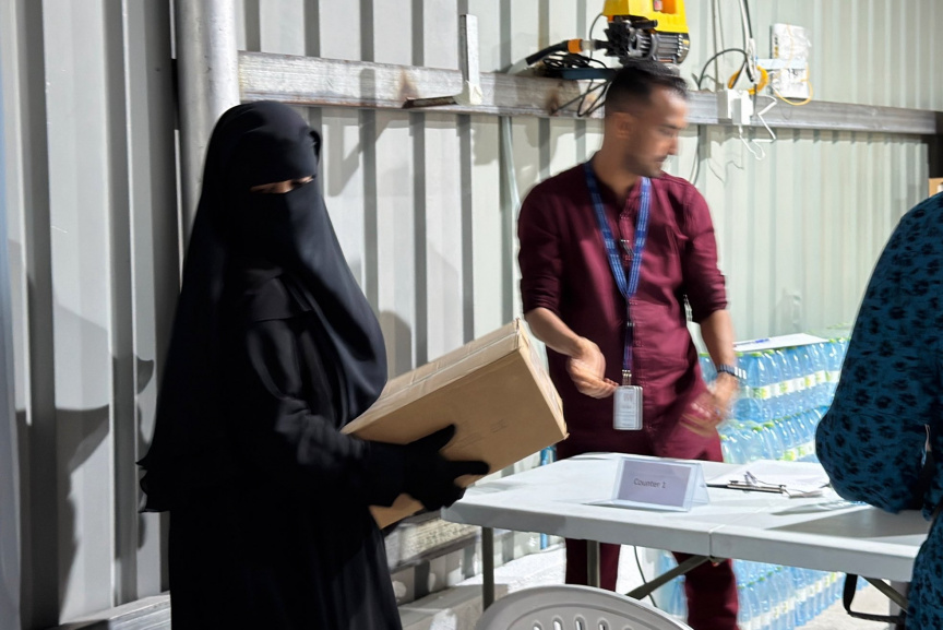 A woman collects a case of canned tuna on January 25, 2026. (Photo/Local Government Ministry)