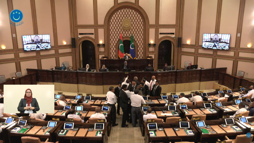 The Parliament sitting on Tuesday was paused to clear out lawmakers from the main opposition Maldivian Democratic Party (MDP) who were asked to leave for protesting inside the chambers and disrupting the session.