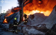 Ukrainian servicemen carry containers backdropped by a blaze at a warehouse after a bombing on the outskirts of Kyiv, Ukraine, Thursday, March 17, 2022. (AP Photo/Vadim Ghirda)